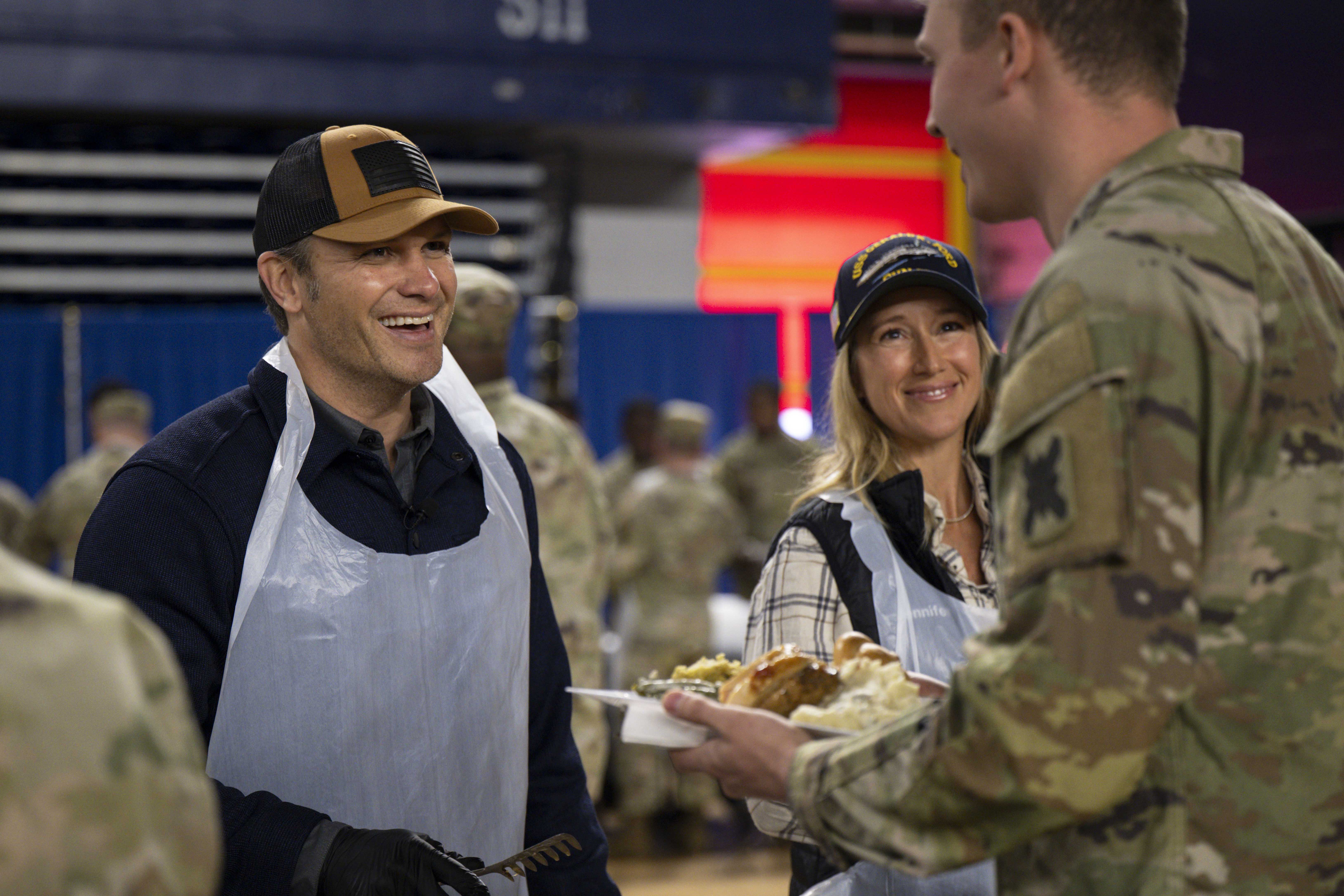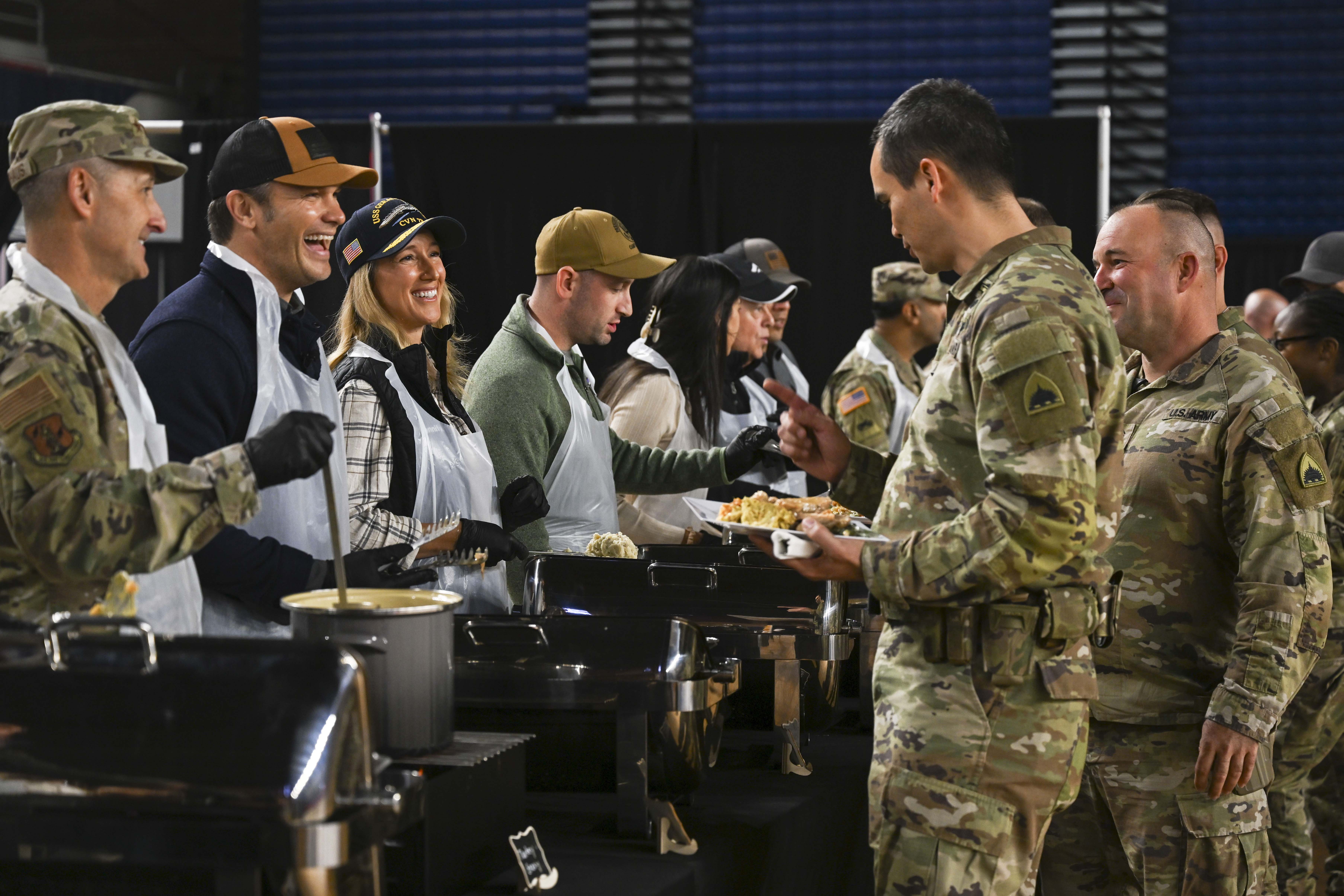 After addressing the guardsmen, the secretary and his wife, Jennifer; along with Miller and his wife, Katie; and other department and administration senior leaders, served a Thanksgiving dinner to uniformed personnel. Secretary Hegseth and his wife also sat down for dinner with the service members.