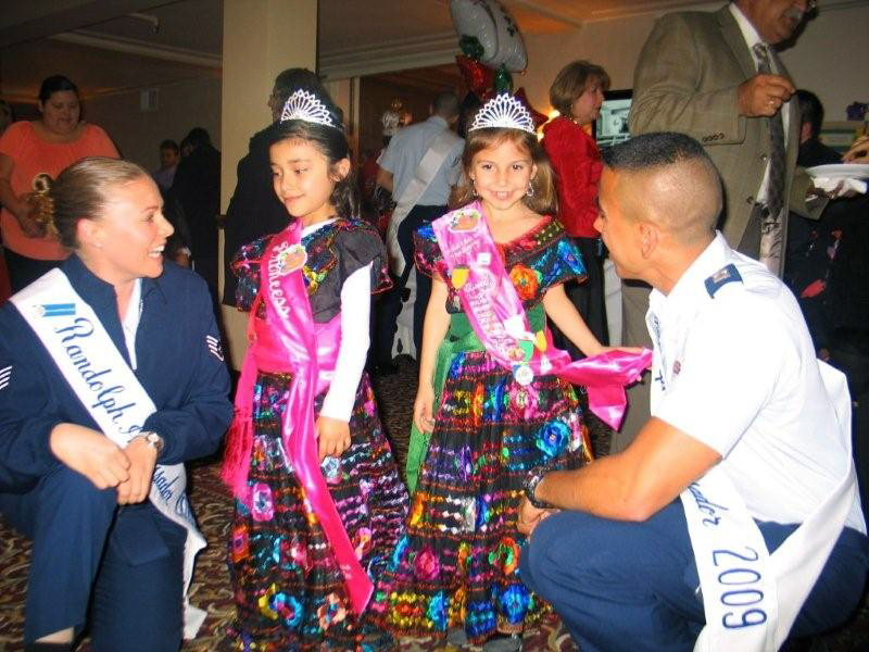 Randolph Ambassadors Staff Sgt. Courtney Linde and Capt. Carlos Ferrer visit with two young dancers who will perform at the "Pinatas in the Barrio" pre-Fiesta celebration during the Fiesta Commission Media Day at St. Anthony's hotel on March 12.
