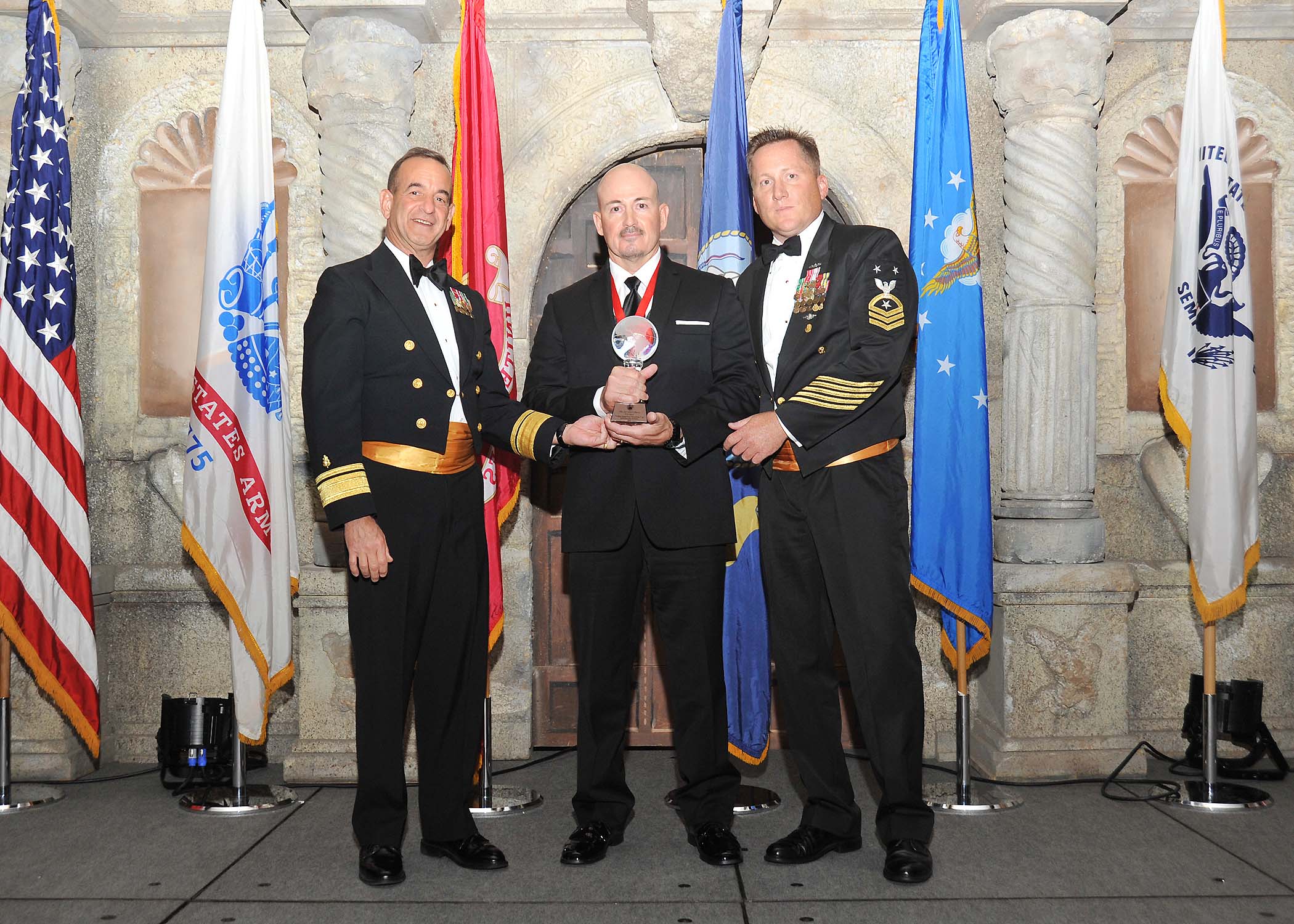 Rear Adm. William Roberts, Medical Education and Training Campus commandant, and Master Chief Petty Officer Rusty Perry, Navy Medicine Education and Training Command command master chief, present Anthony Ortiz, Navy Technical Training Center, with the Navy civilian supervisory category I of the year award.