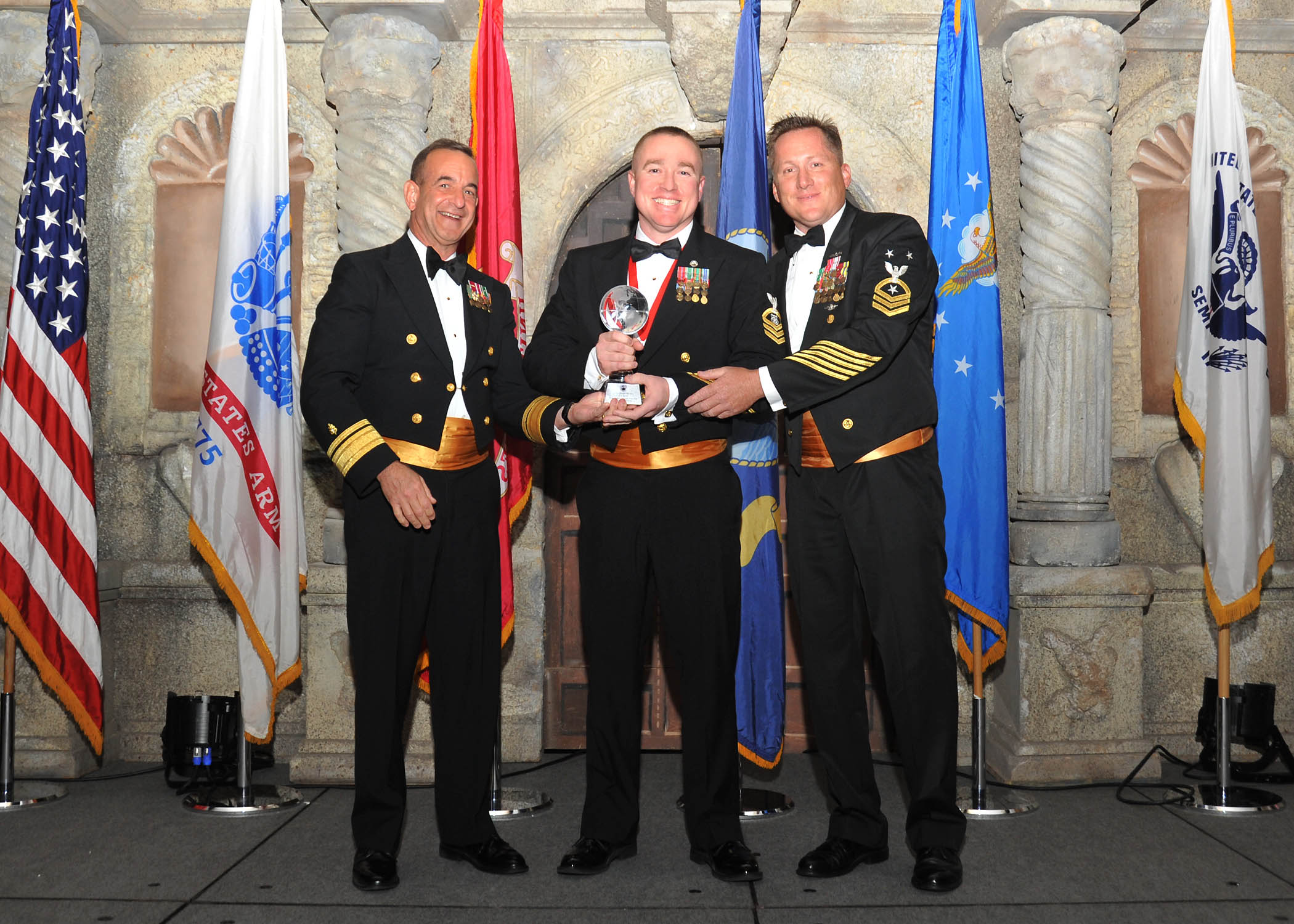 Rear Adm. William Roberts, Medical Education and Training Campus commandant, and Master Chief Petty Officer Rusty Perry, Navy Medicine Education and Training Command command master chief, present Chief Petty Officer Jason Silvis, Navy Technical Training Center, with the Navy senior enlisted member of the year award.