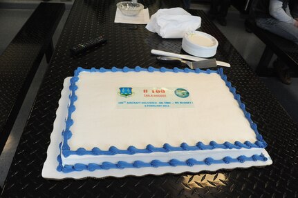 The cake provided in celebration for the 100th on time production aircraft delivered since the 571st Aircraft Maintenance Squadron Operating Location A was stood up at Joint Base San Antonio-Randolph. (U.S. Air Force photo/Rich McFadden) (released)