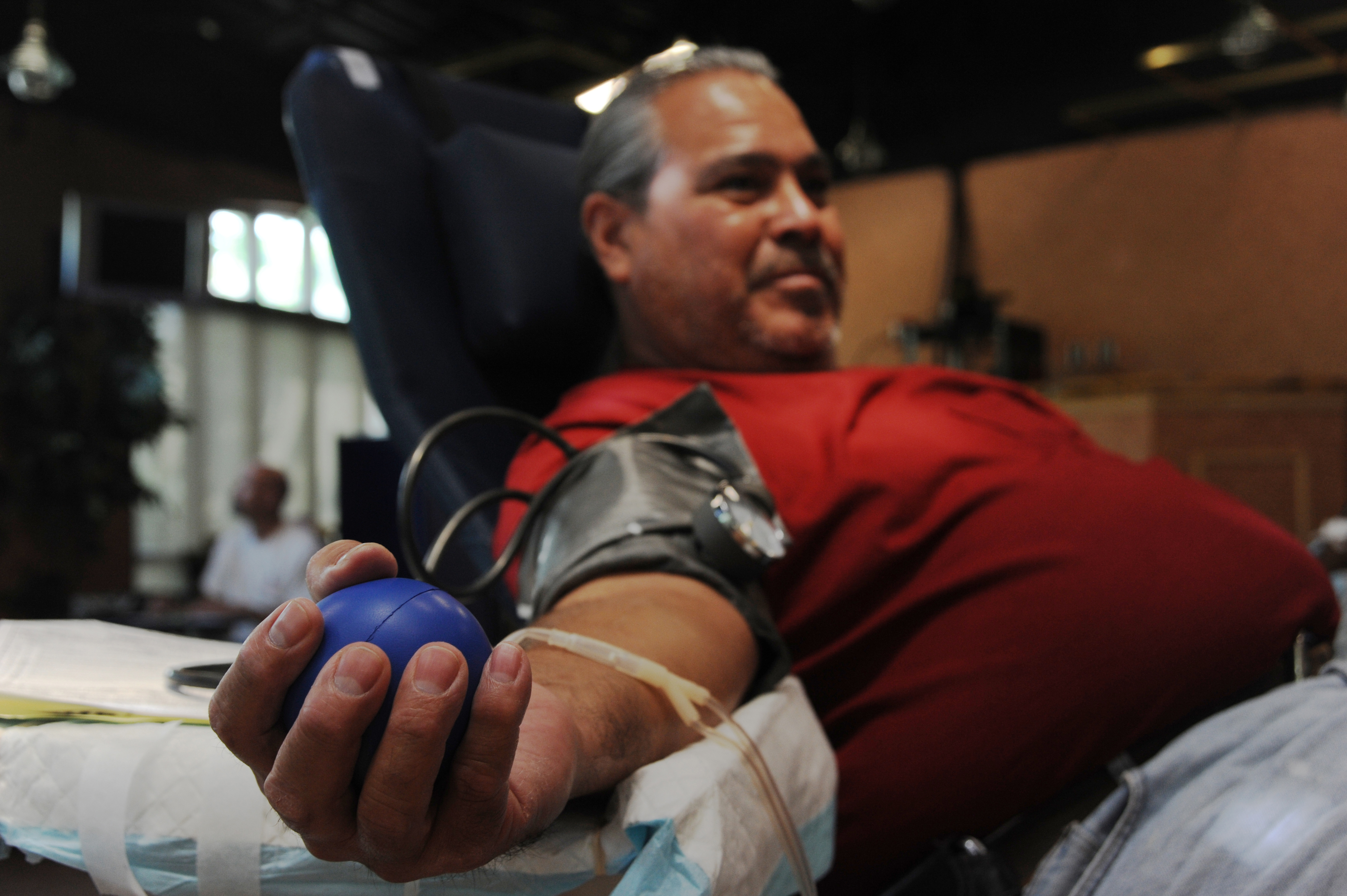 Andrew Ramos, 902nd Civil Engineer Squadron, squeezes a stress ball while donating blood June 10 blood drive at the Kendrick Club on Randolph Air Force base. The blood drive was hosted by the Lackland AFB Blood Donor Center. (U.S. Air Force photo/Rich McFadden) (released)