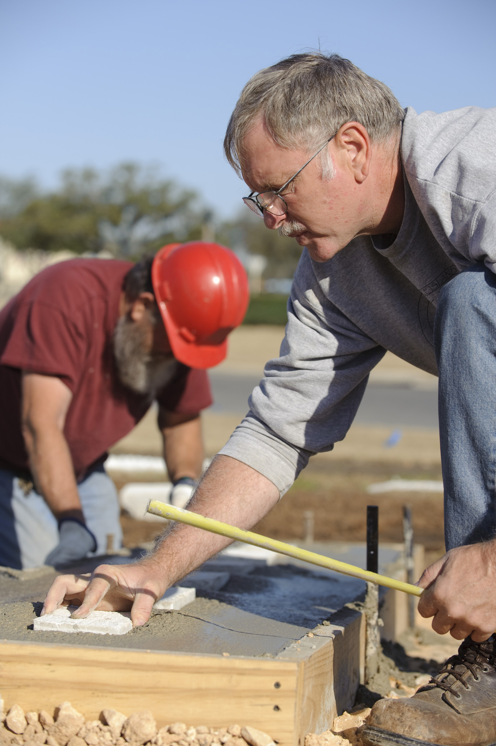 Bill Farrow and Bobby Pogue, 902nd Civil Engineer Squadron cement finishers, align a row of bricks being used to add texture to a freshly -poured concrete letter during the replacement of the Randolph Field letters facing Washington Circle March 11. (U.S. Air Force photo by Steve Thurow)