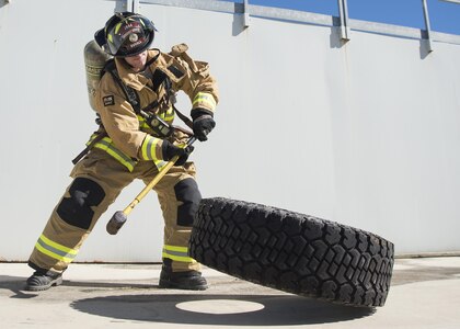 JOINT BASE SAN ANTONIO-RANDOLPH, Texas - Senior Airman Cody Duvall, Joint Base San Antonio-Randolph Fire Emergency Services firefighter, competes in the firefighter combat challenge during the Battle of the Badges competition at Eberle Park on JBSA-Randolph Oct. 22, 2016. In Battle of the Badges, members of the 902nd Security Forces Squadron and the JBSA-Randolph FES face off in various events, including a tactical shooting challenge, firefighter combat challenge and a fire truck pull.
