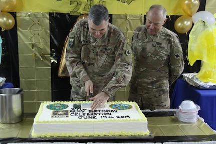 CAMP ARIJAN, Kuwait - Brig. Gen. Clint Walker, commanding general of 184th Sustainment Command, cuts a cake in honor of the last year's Army birthday at Camp Arijan, Kuwait, June 14, 2019. This month, the Army will stream its annual birthday events virtually because of coronavirus restrictions.