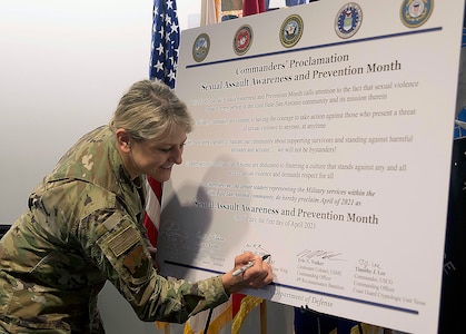 JOINT BASE SAN ANTONIO-FORT SAM HOUSTON, Texas - Brig. Gen. Caroline Miller, 502nd Air Base Wing and Joint Base San Antonio commander adds her signature to the 2021 Sexual Assault Awareness and Prevention Month Proclamation at the 502nd ABW headquarters at JBSA-Fort Sam Houston March 29.