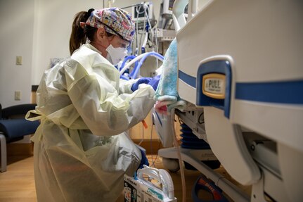 COEUR D’ALENE, Idaho - U.S. Army Capt. Alexis Acuna, a critical care nurse assigned to the 627th Hospital Center, provides care to a COVID positive patient during the COVID response operations at Kootenai Health regional medical center in Coeur d’Alene, Idaho, Sept. 26, 2021. U.S. Northern Command, through U.S. Army North, remains committed to providing flexible Department of Defense support to the whole-of- government COVID response. (U.S. Army Photo by Sgt. Kaden D. Pitt)
