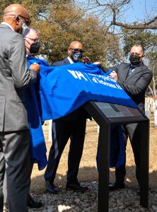 SAN ANTONIO, Texas - (From right to left) Hon. Gabe Camarillo, Undersecretary of the Army; Donald Remy, Department of Veteran Affairs Deputy Secretary; Matt Quinn, Undersecretary of Veterans Affairs for Memorial Affairs; and Jason Holt, descendent of Private 1st Class T.C. Hawkins, reveal the interpretative marker during an unveiling ceremony held at the Fort Sam Houston National Cemetery in San Antonio Feb. 22, 2022. During the ceremony, Camarillo acknowledged the history and sacrifice of the Soldiers from the 24th Infantry Regiment and emphasized the marker unveiling is meant to create a broader understanding of what took place in 1917.
