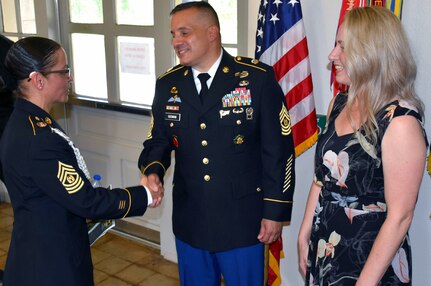 JOINT BASE SAN ANTONIO-FORT SAM HOUSTON, Texas - Command Sgt. Maj. Julie Saorrono (left) congratulates Command Sgt. Maj. Jason Gusman on his assumption of the senior enlisted leader position from Command Sgt. Maj. Chantel Sena-Diaz during a change of responsibility ceremony June 1 at Joint Base San Antonio-Fort Sam Houston, Texas. Saorrono is the Army Contracting Command command sergeant major.