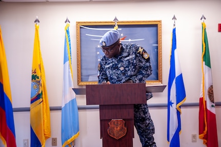 Joint Base San Antonio-Lackland - Warrant Officer Class Two Samando Scott, Jamaican Defence Force, signs the guestbook at the Inter-American Air Forces Academy, June 2, 2022, at at Joint Base San Antonio-Lackland, Texas. Members of the JDF attended the maintenance professional seminar at the Inter-American Air Forces Academy May 31 to June 2, 2022. (U.S. Air Force photo by Vanessa R. Adame)