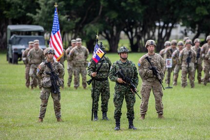 TOLEMAIDA MILITARY BASE, Colombia - U.S. and Colombian Army Soldiers stand in formation during the closing ceremony of Exercise Southern Vanguard 23 at Tolemaida Military Base, Colombia, on Nov. 16, 2022. Exercise Southern Vanguard is U.S. Army South's premier training exercise taking place at the operational and tactical levels intended to increase interoperability between the United States and Western Hemisphere forces. This year's iteration, Exercise Southern Vanguard 23, involves Soldiers from U.S. Army South and the U.S. Army National Guard training alongside Colombian Army soldiers in varying terrain while conducting weapon familiarization lanes culminating in a bilateral military training operation.