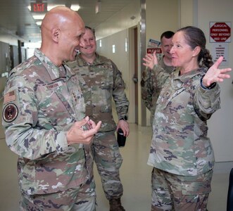 JOINT BASE SAN ANTONIO-FORT SAM HOUSTON, Texas - U.S. Air Force Lt. Gen. Brian Robinson, commander, Air Education and Training Command, talks with Col. Kristen Beals, vice wing commander of the 59th Medical Wing, at Brooke Army Medical Center, Fort Sam Houston, Texas, Aug. 14, 2023. The AETC command team visited BAMC for a closer look at the different mission sets that are overseen by members of the 59th Medical Wing.