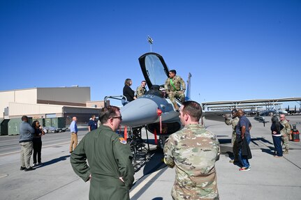 JOINT BASE SAN ANTONIO-LACKLAND - 16 Greater San Antonio area civic leaders learn about the 926th Wing F-16 Fighting Falcon missions on the flightline at Nellis Air Force Base, Nevada, Oct. 23, 2024. The leaders learned how fighter pilots emulate adversarial tactics for the aggressor mission and implement the tactics during various military exercises. (U.S. Air Force Photo by Master Sgt. Jacob Lewis)