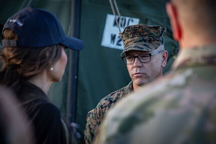 NAVAL STATION GUANTANAMO BAY, Cuba - Marines assigned to 1st Battalion, 6th Marine Regiment, 2d Marine Division speaks with Department of Homeland Security (DHS) Secretary Kristi Noem during her visit to Naval Station Guantanamo Bay, Cuba, Feb. 7, 2025. Joint Task Force Southern Guard the illegal aliens holding operations led by DHS at Naval Station Guantanamo Bay, Cuba. (U.S. Army photo by Staff Sgt. ShaTyra Cox)